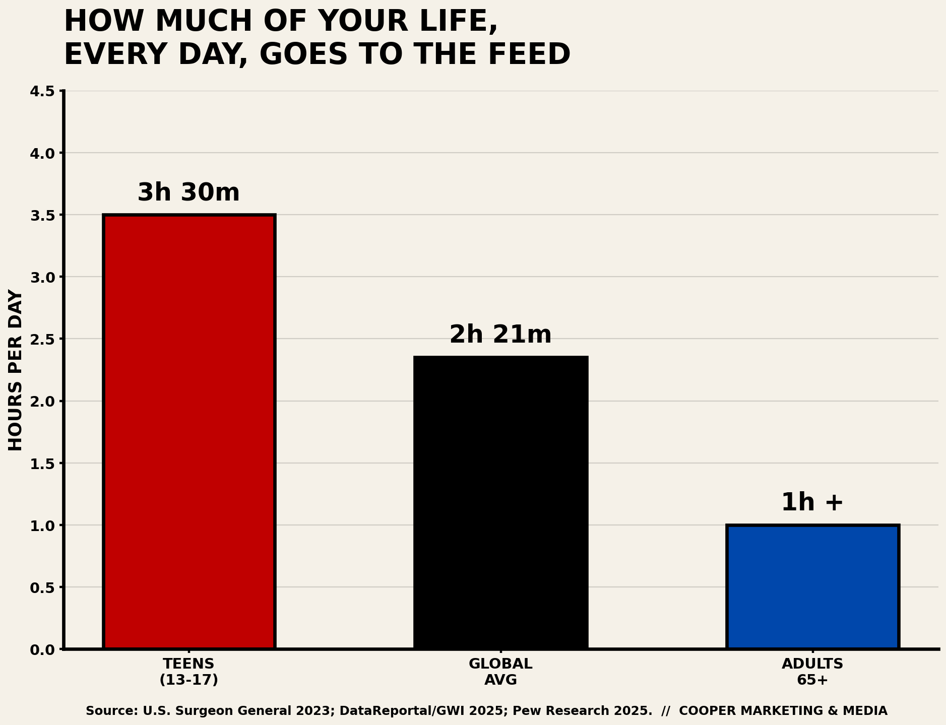 Teens are the ones to worry about. 95% of kids between 13 and 17 report using a social media platform, and more than a third say they use it “almost constantly,” according to the 2023 U.S. Surgeon General's advisory on social media and youth mental health. Teens who spend more than three hours a day on these platforms face roughly double the risk of depression and anxiety symptoms. The average is 3.5 hours. Do the math and weep quietly into your napkin.