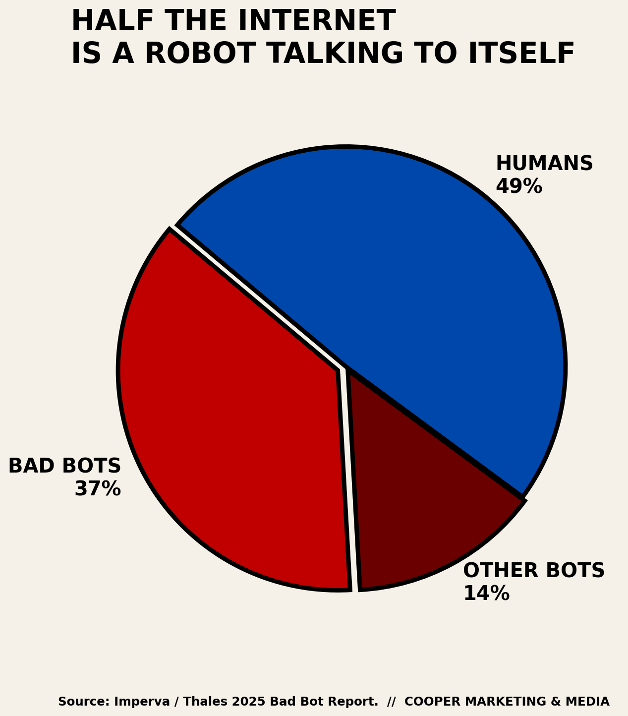 Here is the kicker from the Imperva 2025 Bad Bot Report. Automated traffic, meaning bots, now accounts for more than half of all internet traffic, and bad bots alone account for thirty-seven percent. The robots are winning. Half of what you think is a conversation is a machine talking to another machine while you pay for the electricity.