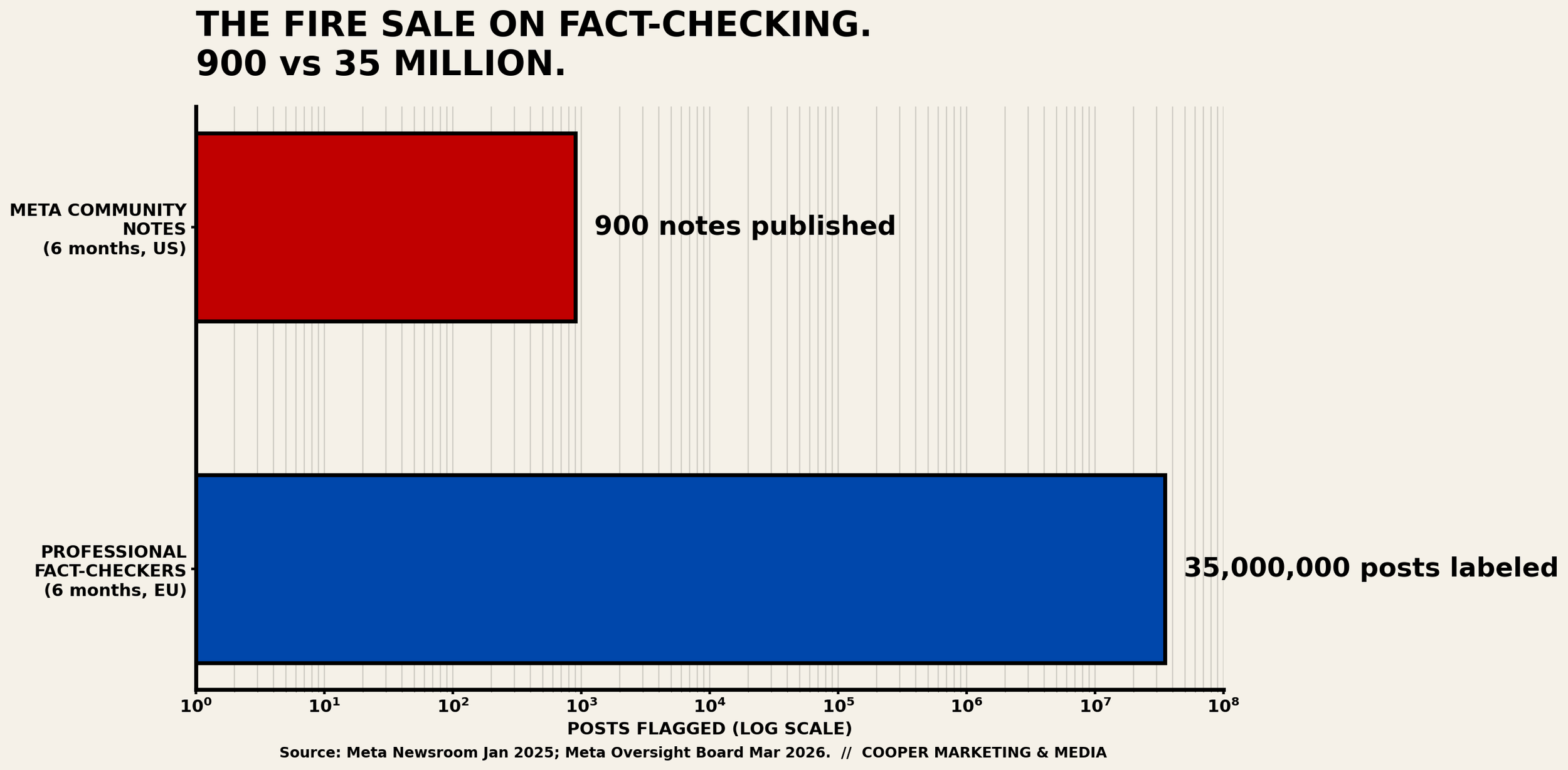 Fact-checking, meanwhile, just got a field demotion. On January 7, 2025, Meta announced it was killing its third-party fact-checking program, which had worked with more than ninety International Fact-Checking Network partners reviewing content in sixty languages since 2016, and replacing it with a crowd-sourced Community Notes system modeled on the one at X. Meta’s own Oversight Board has since warned that Community Notes is not an adequate substitute, particularly in elections, crises, and repressive regimes. Early numbers are brutal. In the first six months of the U.S. rollout, Meta’s platforms published roughly nine hundred Community Notes. In the same six-month window, professional fact-checkers had previously labeled around thirty-five million posts across the European Union under the old system. Nine hundred versus thirty-five million. That is not a pivot. That is a fire sale.