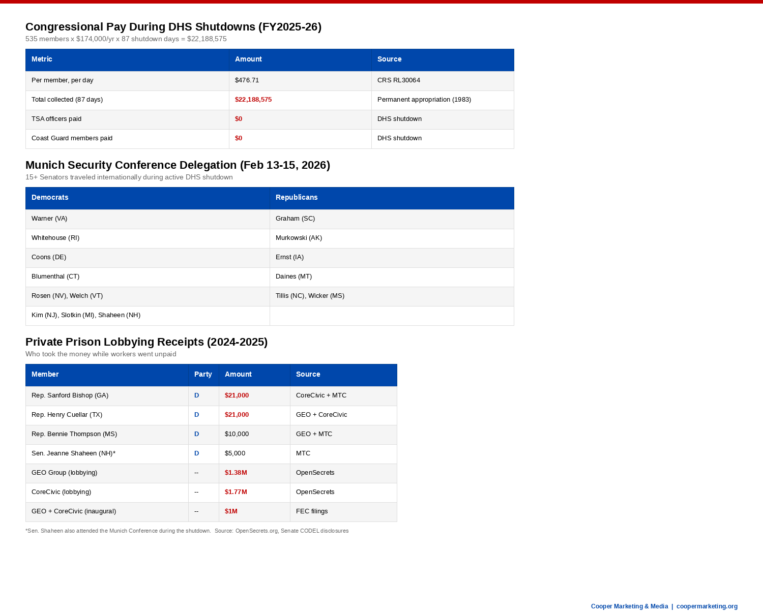 On February 13, 2026, one day before the current DHS shutdown began, a bipartisan delegation of more than 15 United States Senators departed for the Munich Security Conference in Germany. Co-led by Senator Sheldon Whitehouse (D-RI) and Senator Lindsey Graham (R-SC), the delegation included: