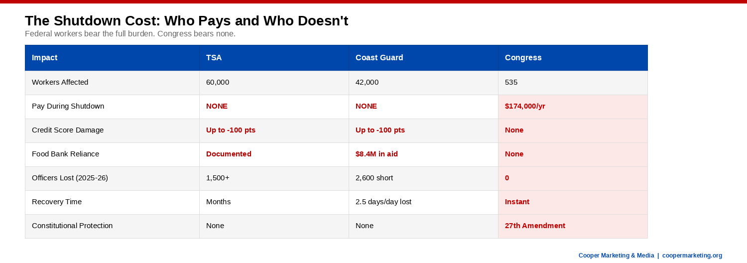 During the 2018-2019 shutdown, 35 days, the longest in American history, TSA officers worked without pay. Unscheduled absences climbed to nearly 10% on some days. Officers could not pay rent. Could not buy groceries. Could not make car payments. They showed up anyway, because that is what the job requires.