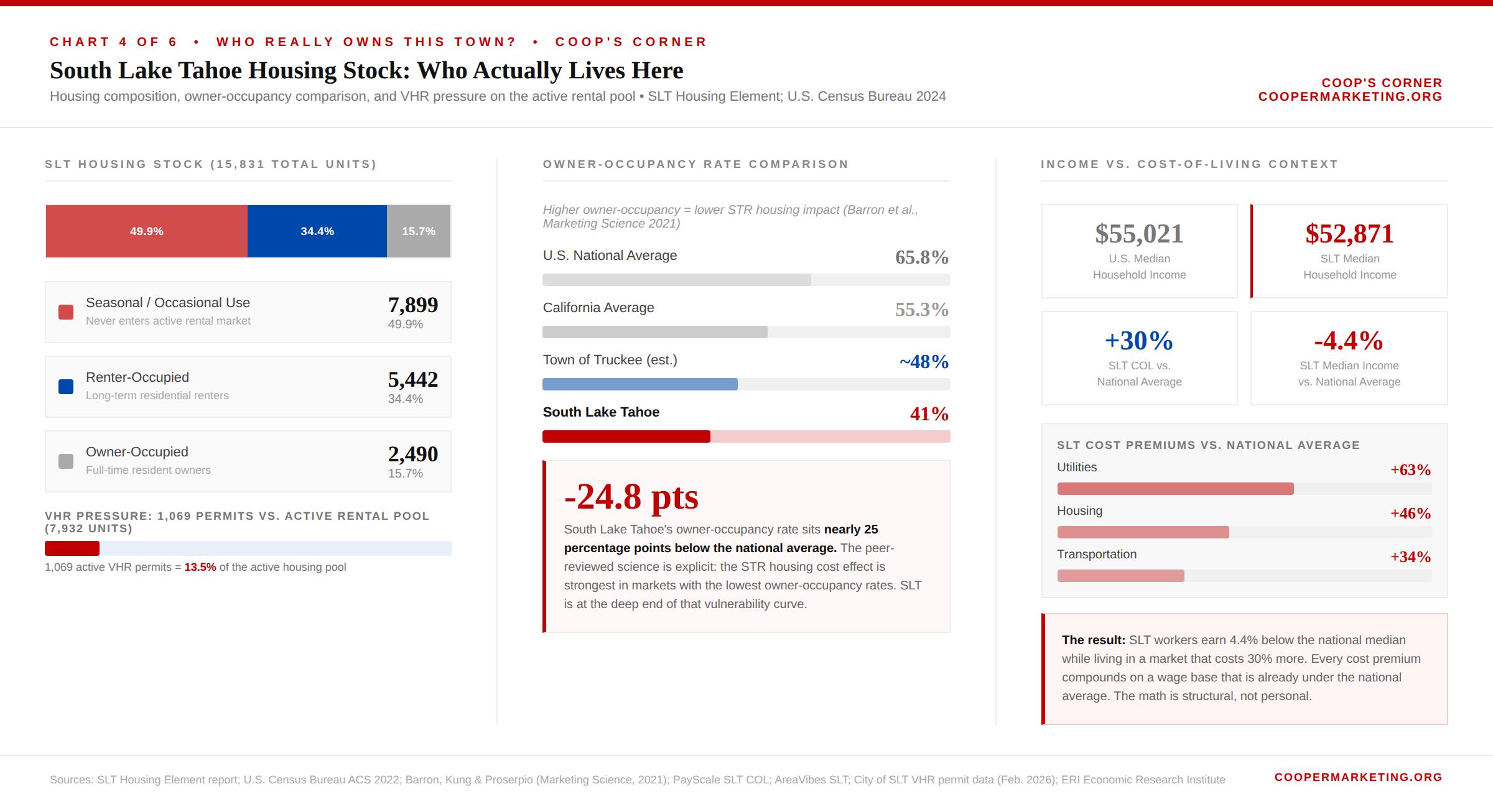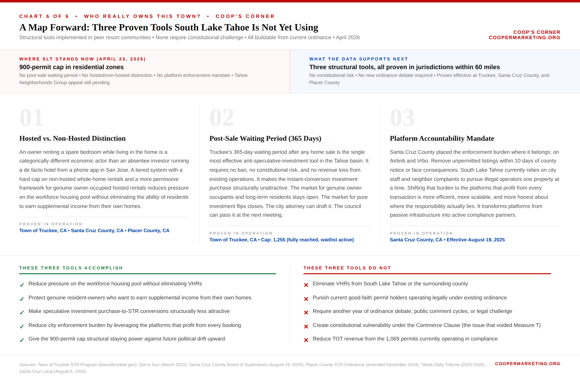 The communities that have found the most durable balance did not pick a single number in isolation. They used a combination: a total permit number anchored to local housing stock analysis, a geographic distribution requirement, and an owner-occupancy differential. That framework is not hypothetical. RRC Associates has built exactly this model for Summit County, Colorado, Pitkin County, Colorado, and Teton County, Wyoming. It exists. South Lake Tahoe has never commissioned it. It should be the first agenda item at the next council meeting.