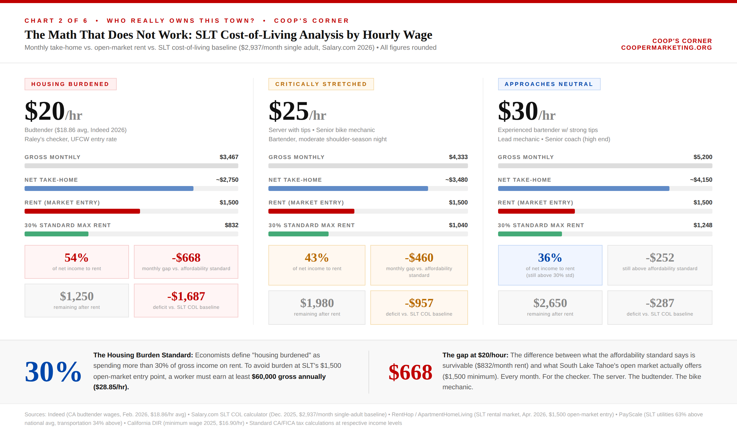 The standard economists use to define a housing-burdened household is 30 percent of gross income to rent. At $20 per hour, the 30 percent threshold works out to $832 per month in rent. The open market starts at $1,500. That gap, $668 per month, is not a rounding error. It is structural. And it does not close at $25 per hour. At $25 per hour, a worker is still running a monthly deficit against the Salary.com South Lake Tahoe cost-of-living baseline of $2,937 for a single adult.