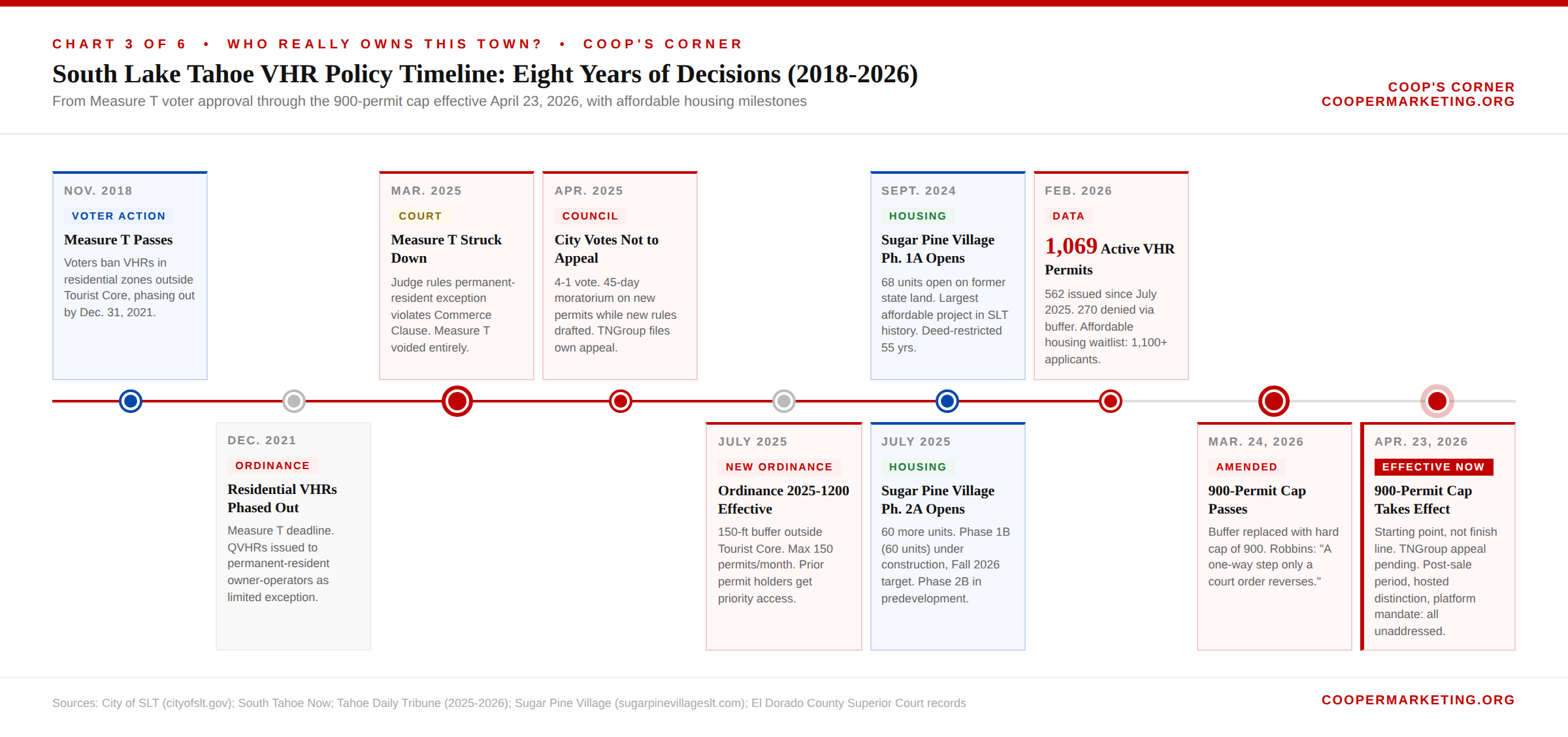 To get here took seven years of political struggle, two ballot measures, multiple court rulings, and a community divided so evenly that the original Measure T passed by exactly 58 votes in 2018. It was struck down by an El Dorado County judge in March 2025. The City Council voted not to appeal in April 2025. The Tahoe Neighborhoods Group filed its own appeal, which remains pending.
